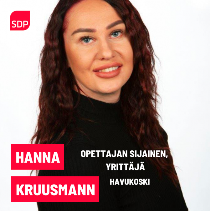 Hanna Kruusmann, opettajan sijainen, yrittäjä, Havukoski. https://www.facebook.com/Hanna-Vantaan-valtuustoon-101536945266956