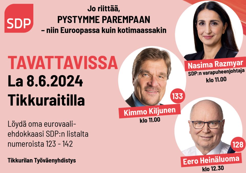 Eurovaaliehdokkaita ja SDP:n varapuheenjohtaja ovat tavattavissa lauantaina Tikkuraitilla. Tule osoittamaan tukesi ja muista äänestää!